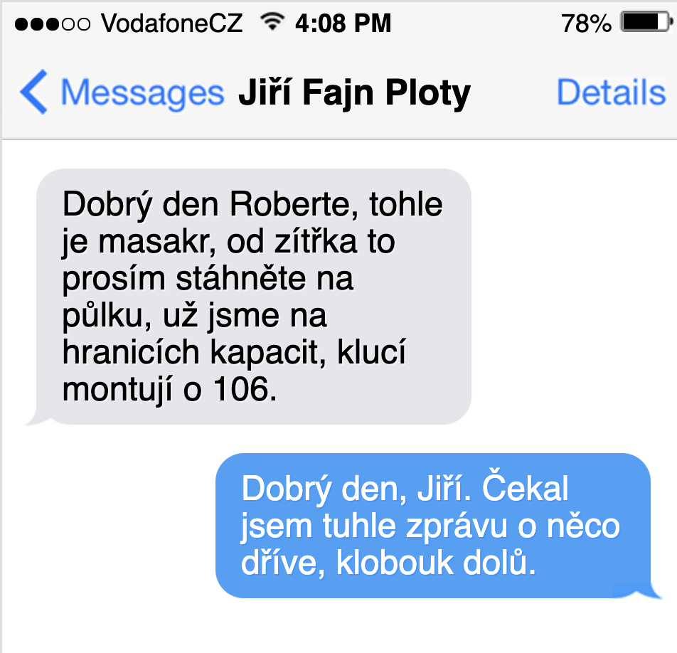 Pustili jsme se do práce velice rychle, což bylo za mě opravdu klíčové, protože včera už bylo pozdě.. a byl to opravdu frmol, nakonec to dopadlo ještě lépe, než kdyby ten projekt dopadl a aktuálně mám stabilní příjem práce pro všechny party minimálně na 2-3 měsíce dopředu. S panem Hartmanem je radost pracovat, potrpím si na tom, aby se udělalo, co se slíbí a zatím bez chyby, co jsme si řekli, to se udělalo a za třetinu peněz, než jsem čekal.
